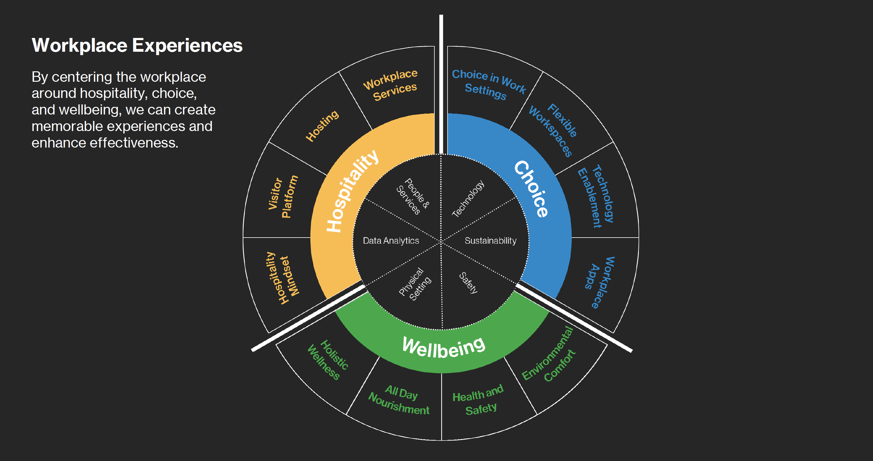 Our experiences will be aligned to 6 key principles. We can enable our workplace to perform better through coordination across services, technology, sustainability, safety, physical settings, and data analytics.